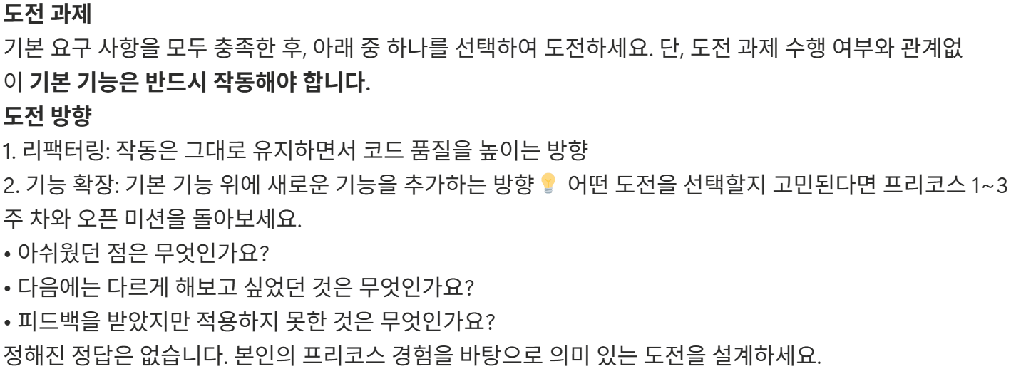 이번 기수는 자유롭게 미션을 설계하고 수행하도록 하는 오픈 미션이 처음 도입되었는데, 이 부분이 최종에도 반영이 된 것 같다. 나는 사실 3주차 하면서 마음에 안 들던 미션 기준이 있어서 그 부분을 생각하며 기능 확장 미션을 선택하기로 했다.