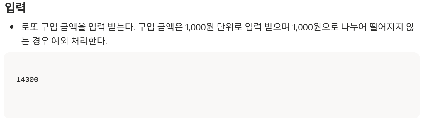 자판기에서 커피를 뽑을 때 500원짜리 음료수를 뽑아야할 때 1000원권밖에 없는 경우를 떠올려 보자! 이때 500원이 아니므로 구매할 수 없다고 하면 어떨까? 돈이 있음에도 불구하고 구매하지 못하는 아이러니한 상황이 일어날 것 같다. 이런 상황을 떠올리며 700원을 입력하면 500원으로 로또 한 장을 구매하고, 거스름돈 200원을 돌려주는 형태로 기능을 구현했다.