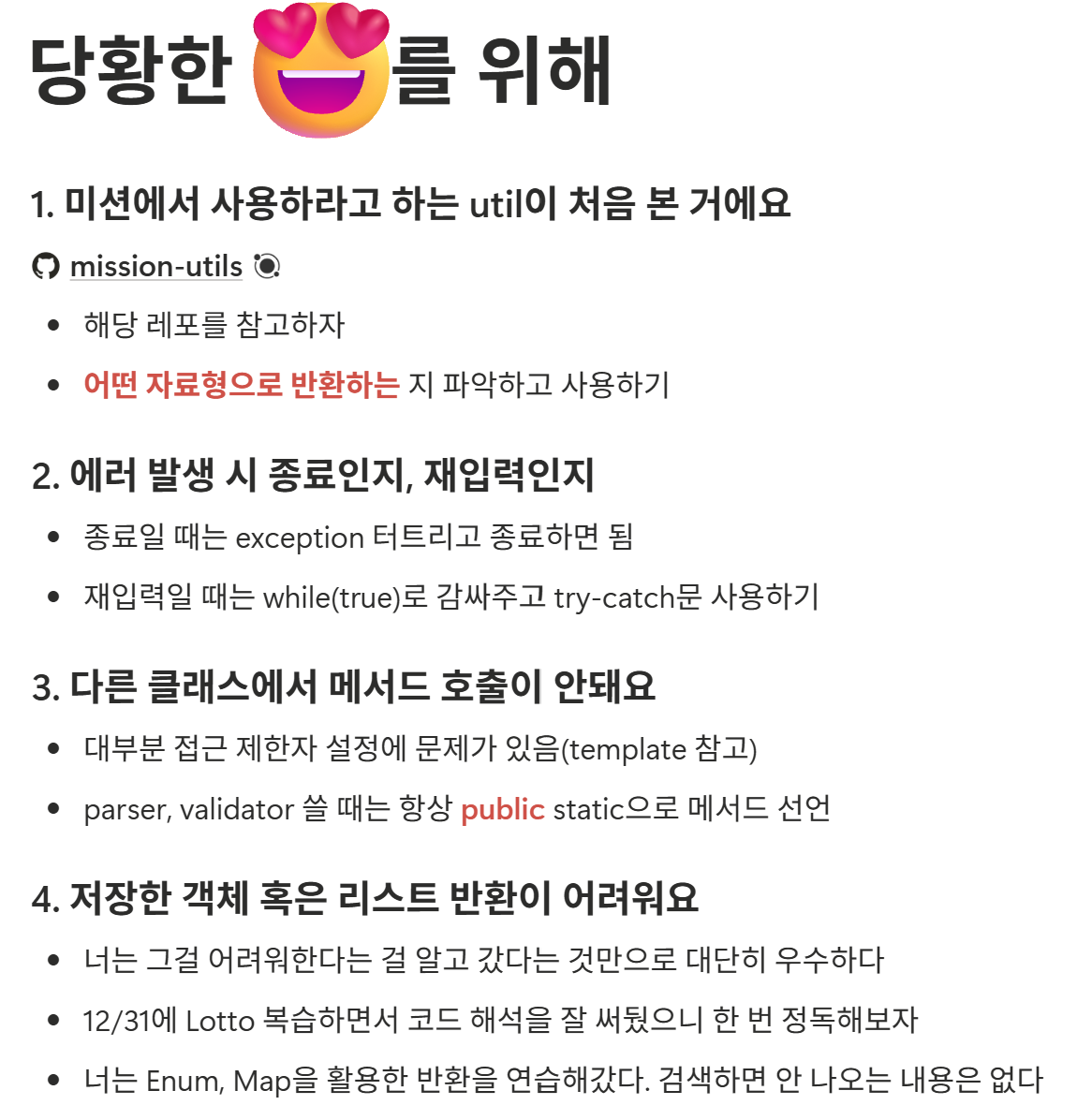 이번 문제는 행성 로또로 이번 기수 3주차 미션과 거의 동일하고 몇몇 조건만 다른 문제였다. 그래서인지 문제 푸는 시간을 4시간으로 줄이고, 1시간은 소감문 작성 시간으로 한다고 했다. 이번 미션에서 우테코가 보고자하는 포인트가 크게 2가지 달라졌다.