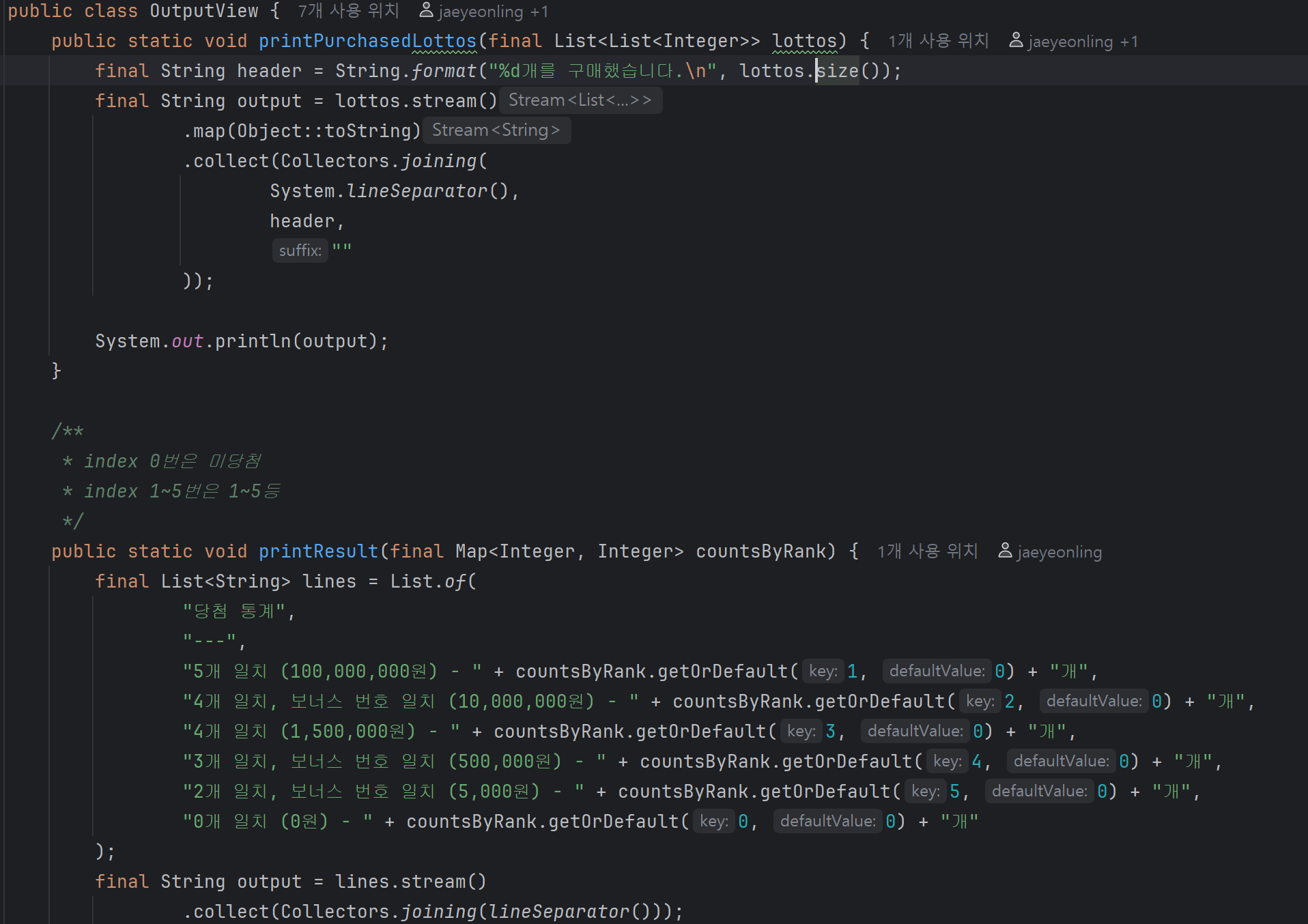 OutputView를 확인하면서 반환형이 좀 복잡하다고 생각했다. 위에 있는 메서드는 List가 List<Integer>형태로 값을 저장하고 있고, 밑에는 Map<Integer, Integer>형태로 Key = 등수, Value = 해당 로또 개수로 받고 있다. 이런 부분을 먼저 파악하고 들어가니까 서비스 로직 짤 때도 할 만했던 것 같다.