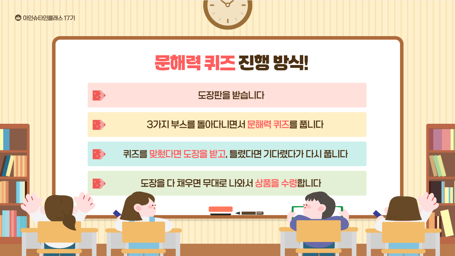 4팀으로 나눠서 3부스를 로테이션 시키고, 남는 한 팀은 소감문 작성이랑 4행시 작성하기를 시켰다!