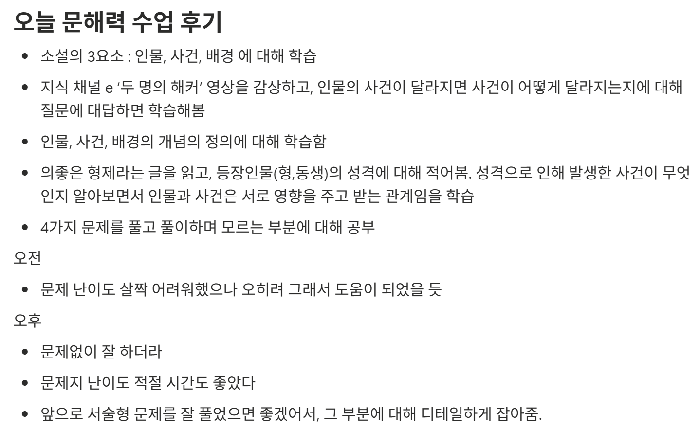 오전반 친구들은 확실히 이해도가 부족해서 시청 후에 어제 수업이랑 연계해서 등장인물, 줄거리, 인물의 성격과 사건 위주로 설명을 해줬다. 오후반 친구들은 고전 문학이라서 모르는 단어가 몇 개 나오길래 해설해주고, 이해가 안 가는 인물의 심리와 그에 따른 행동을 반어, 역설의 개념과 연관지어 설명해줬다.