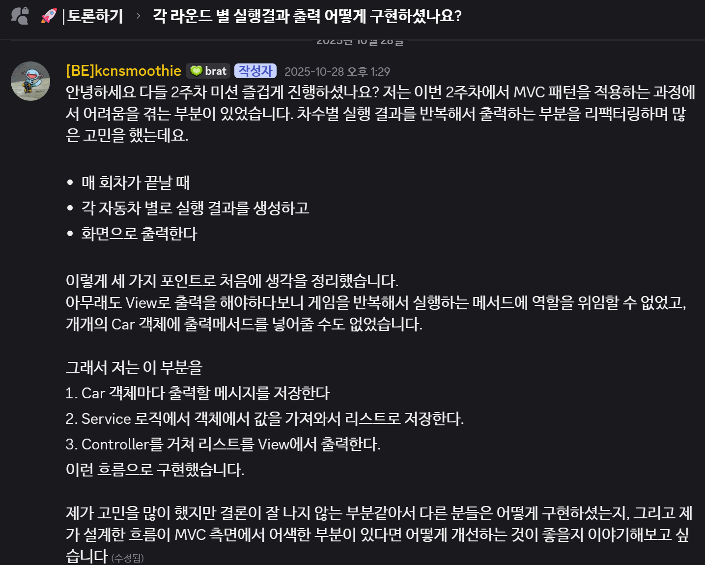 저번 주차 미션을 진행하면서 MVC 패턴을 적용하는 과정에서 각 라운드별 실행 결과를 어떻게 출력하는 것이 좋은 구조일까 하는 고민이 생겼습니다. 혼자 고민하다가 방향이 명확히 잡히지 않아 디스코드 토론하기에 질문 글을 올려 다른 분들과 의견을 나누었습니다.