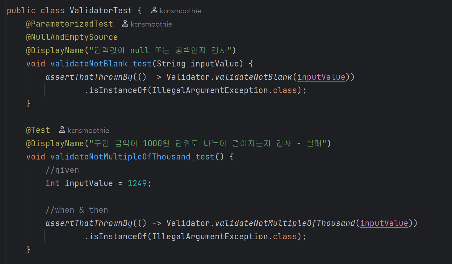 테스트도 한결 편해졌습니다. Validator의 각 메서드에 대한 개별적 테스트 코드를 작성하고 검증했습니다. 만약 저번 주차처럼 테스트 코드가 한 메서드 안에 뭉쳐있고 중복되는 코드가 있었다면 테스트 코드 작성이 어려웠을 것입니다.