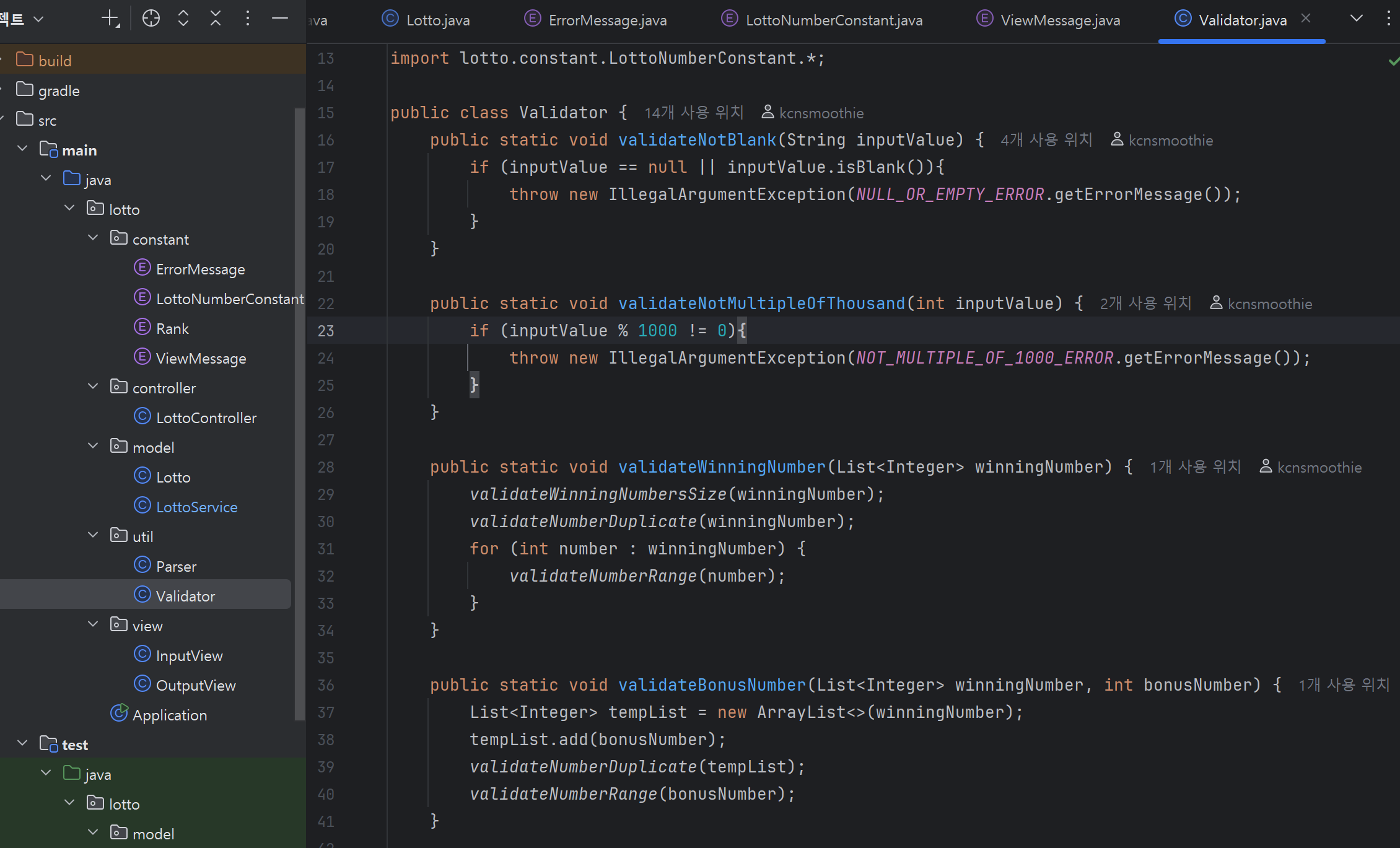 로또 미션에서는 사용자의 입력값이 여러 가지 형태로 주어졌습니다. 로또 구입 금액, 당첨 번호, 보너스 번호가 있었는데, 이 세 입력값 모두에서 유효성 검증이 필요했습니다.